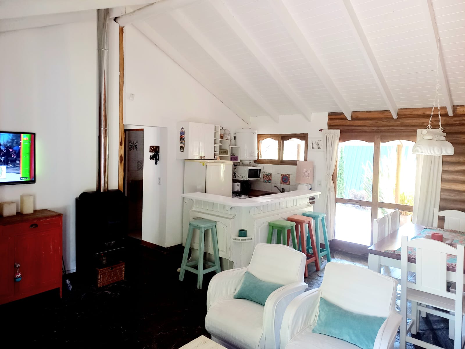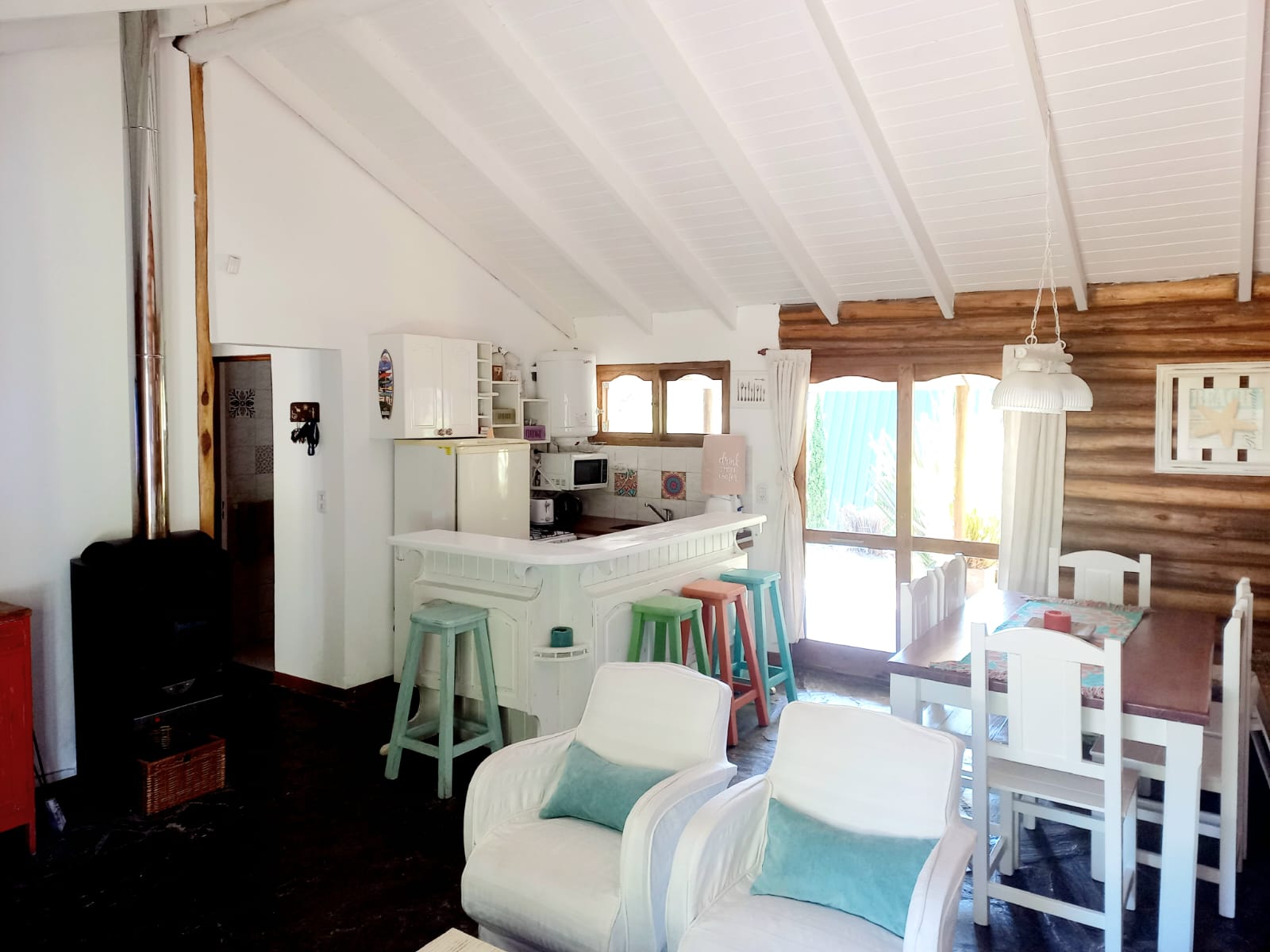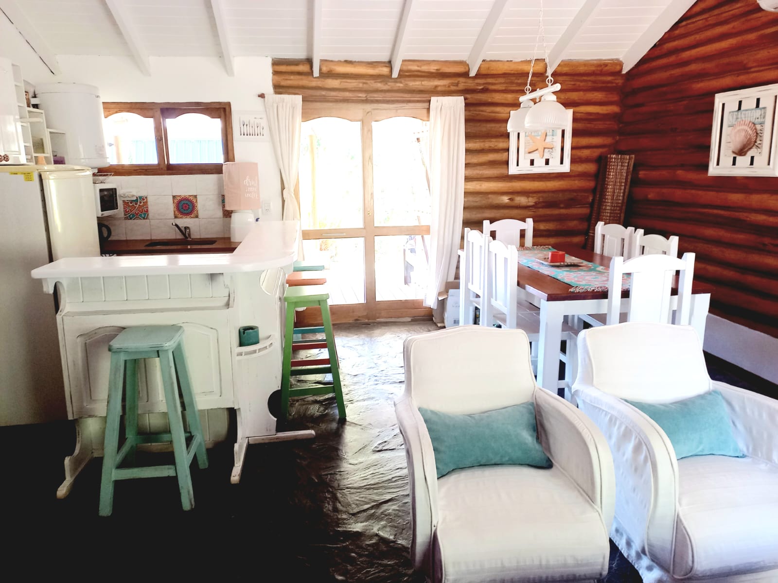 Casa de troncos en Sauce Grande de dos dormitorios, en excelente estado para 4 personas, con estacionamiento y parrilla, aire acondicionado, wifi, tv cable, heladera con freezer y microondas.