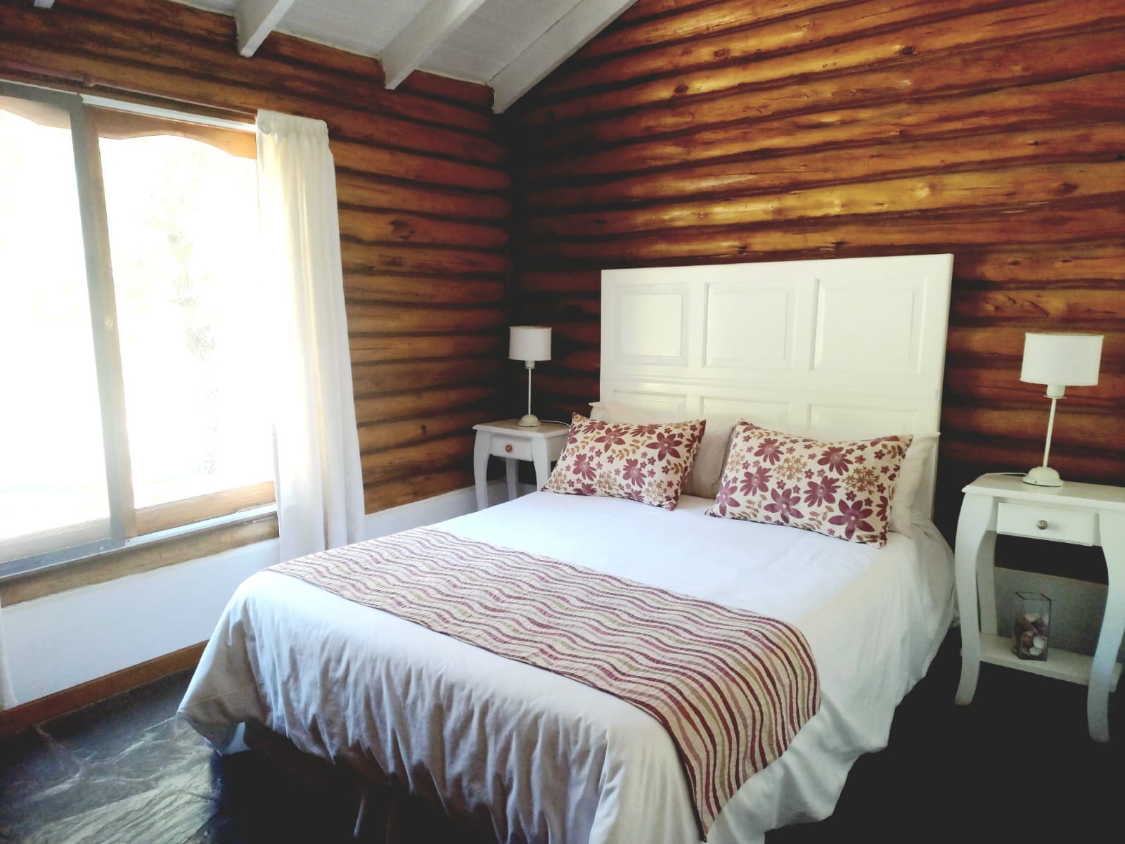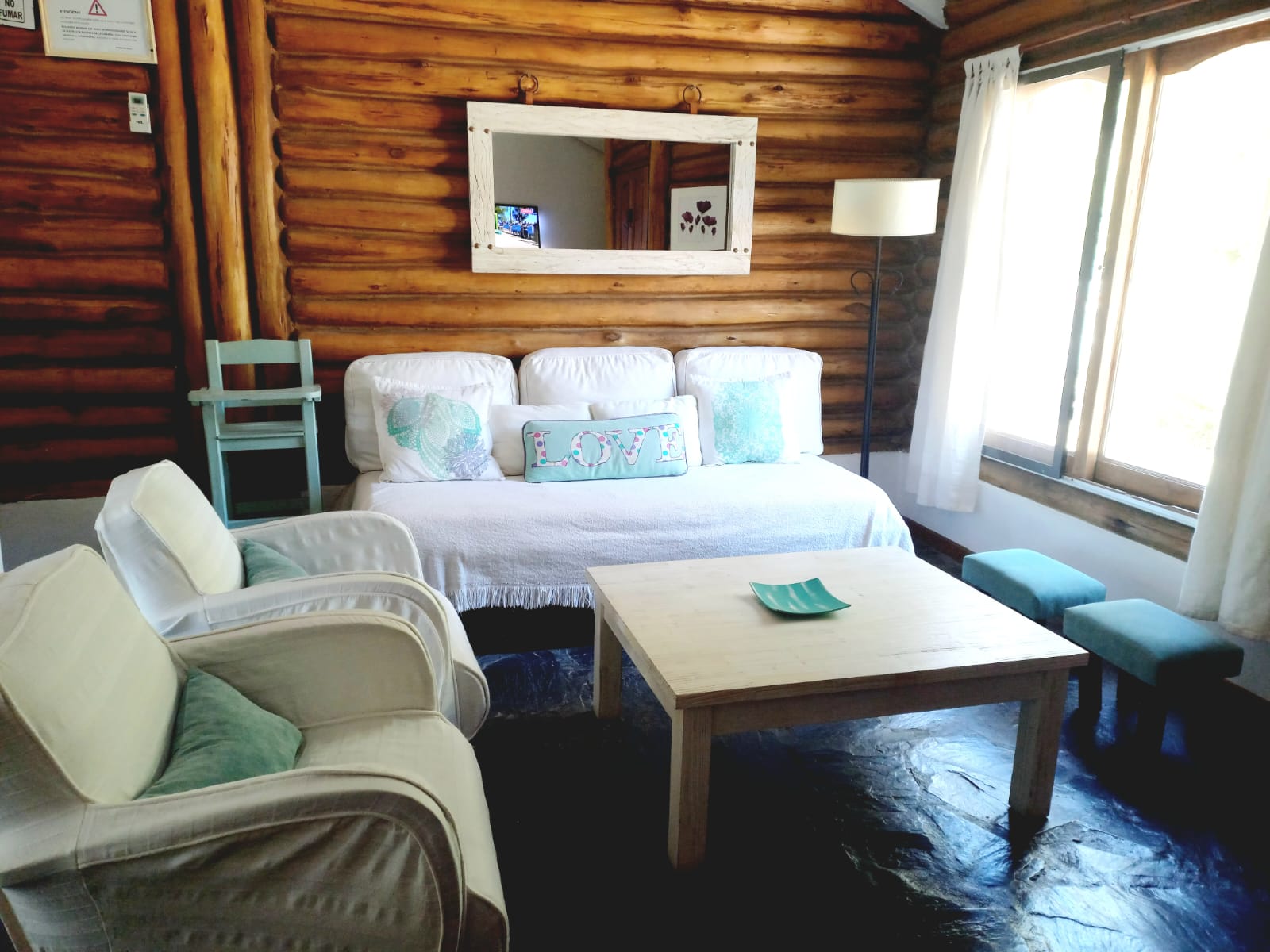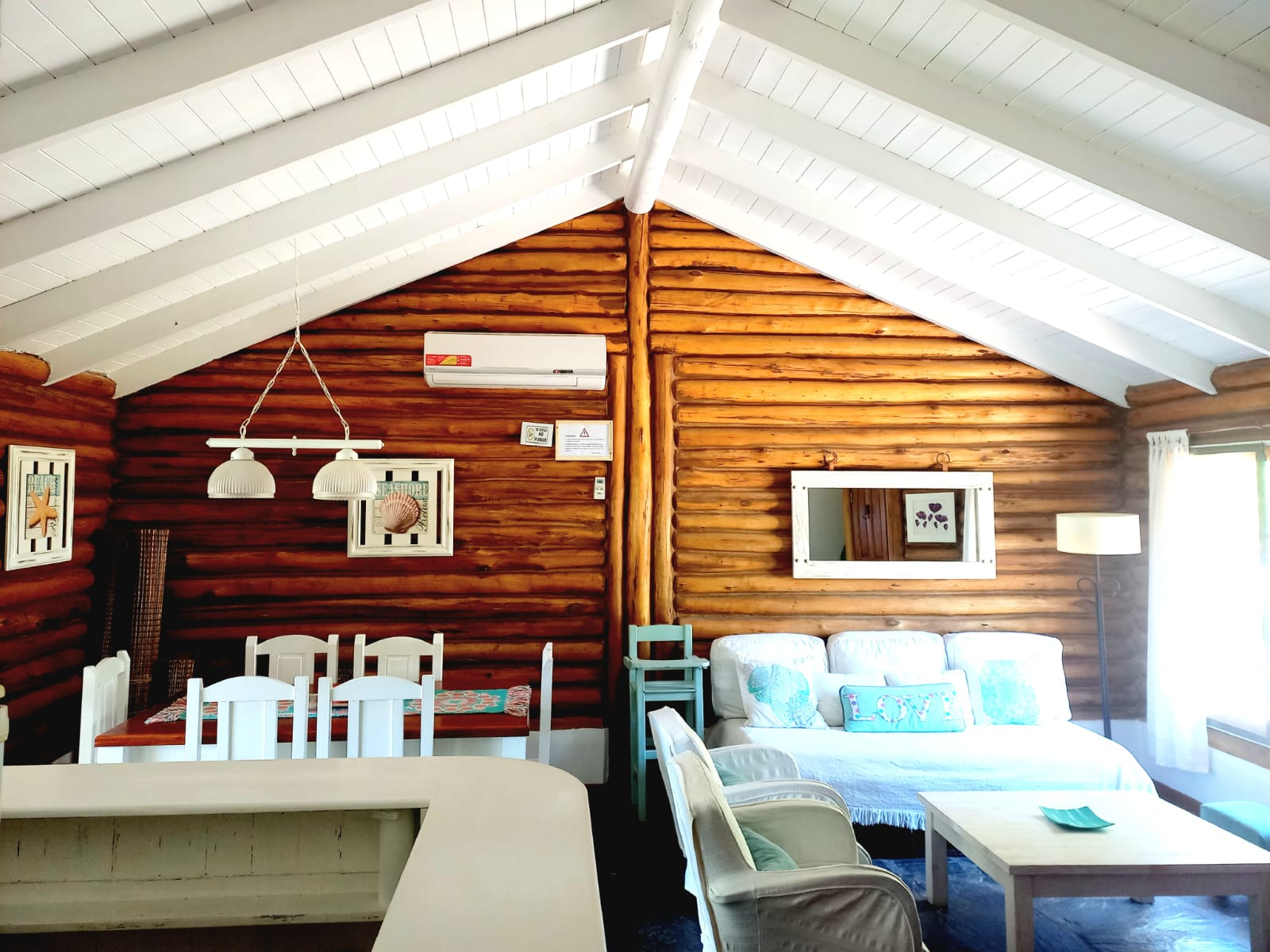 Casa de troncos en Sauce Grande de dos dormitorios, en excelente estado para 4 personas, con estacionamiento y parrilla, aire acondicionado, wifi, tv cable, heladera con freezer y microondas.